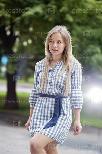 Женщина в платье идет в городском парке