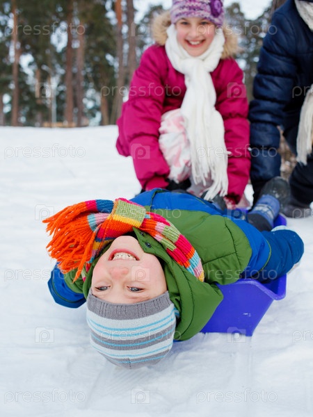 Дети на санках в снегу