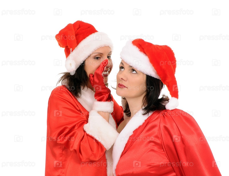 Две молодые девушки в костюмах Санта-Клауса на белом фоне