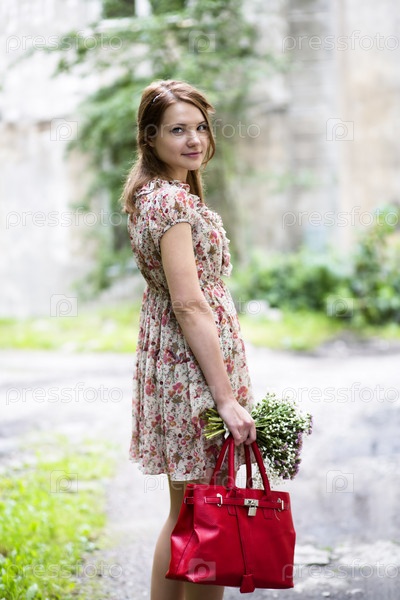 Женщина в платье держит цветы и сумку