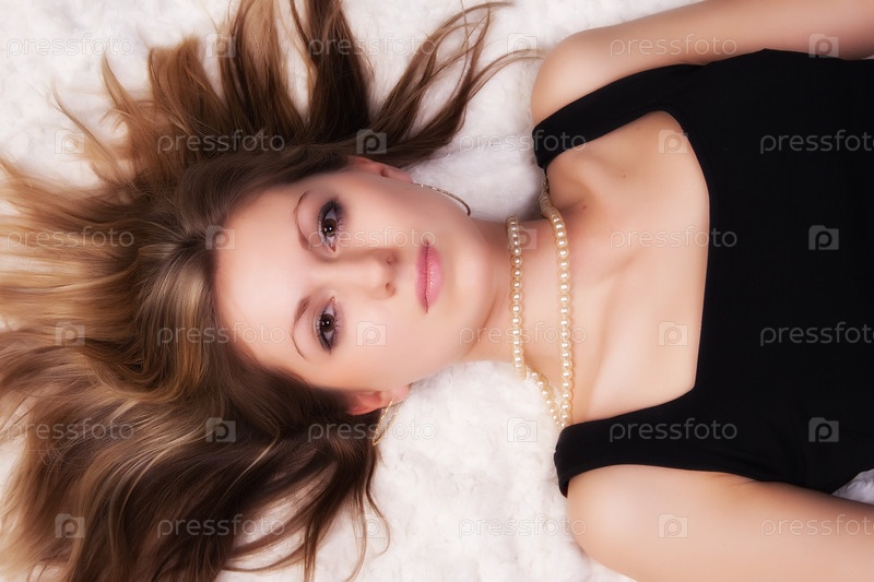 Девушка с русыми волосами вразброс лежит на белом покрывале