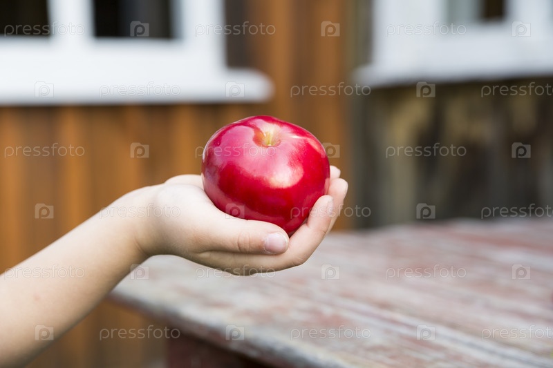 Спелое красное яблоко в детских руках