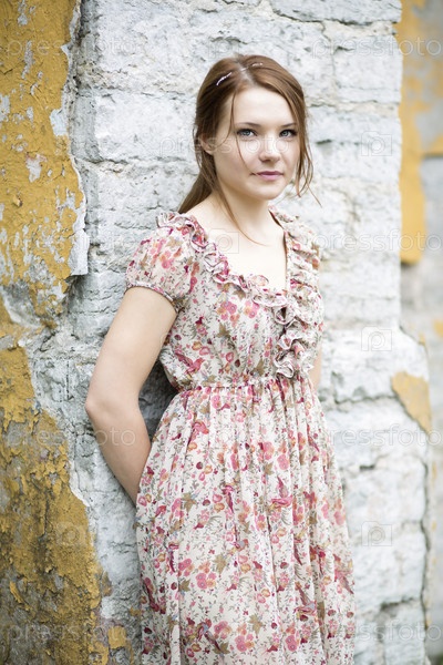 Женщина в платье с цветочным принтом стоит у стены