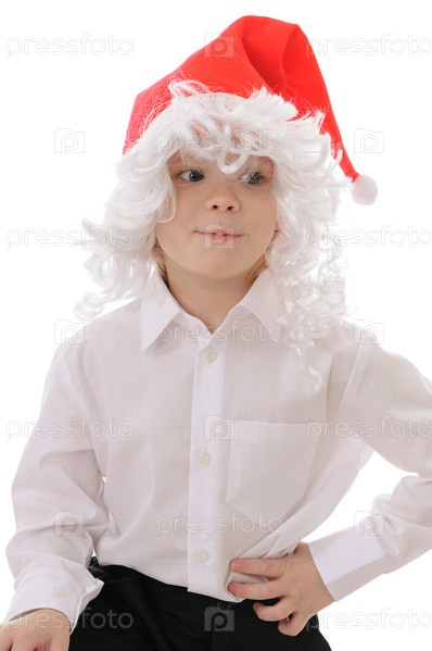Портрет мальчика в шапке Санта-Клауса на белом фоне