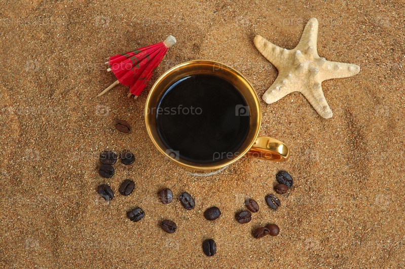 Золотая чашка с кофе, бобами и морской звездой на пляже