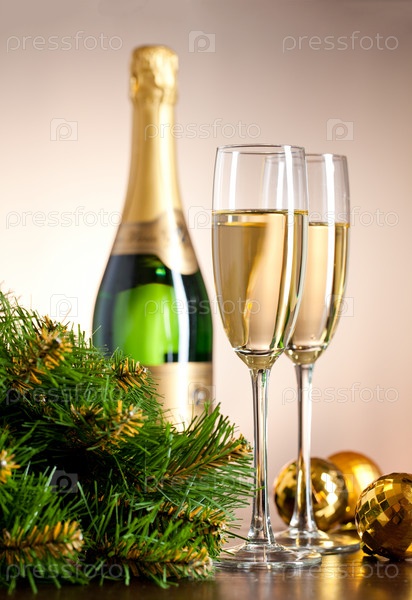 Два бокала шампанского и веточка ели