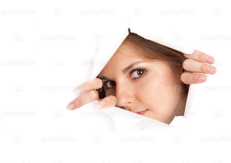 Молодая девушка смотрит через отверстие в бумаге