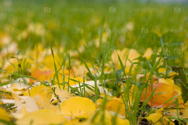 Осенние листья на зеленой траве