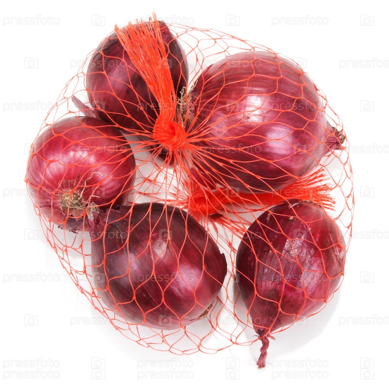 Красный лук в сетке на белом фоне