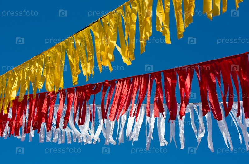 Разноцветные тряпичные гирлянды на фоне синего неба