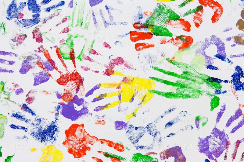 Разноцветные отпечатки рук на белом холсте