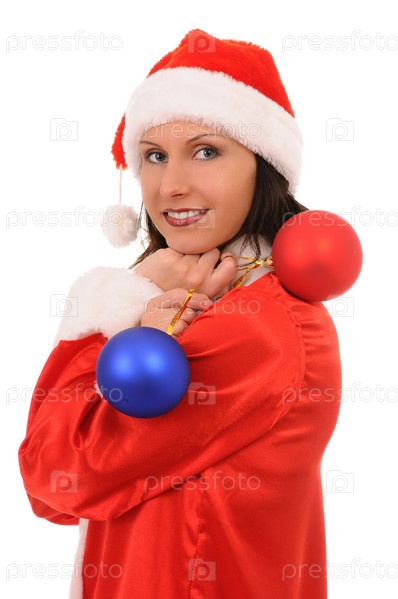 Женщина в костюме Санты с елочными украшениями, белый фон