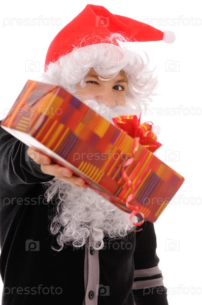 Подросток в шапке Санта Клауса с подарком, изолирован на белом фоне