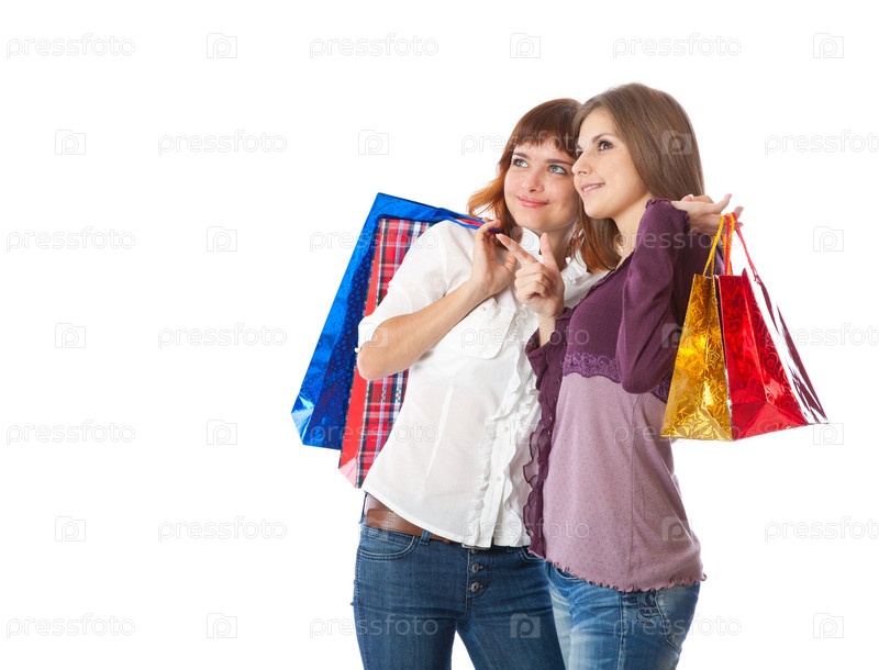 Две девушки с пакетами на белом фоне