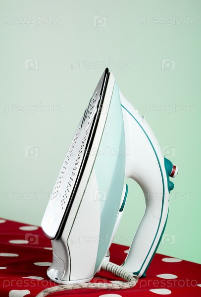Современный утюг на гладильной доске на зеленом фоне