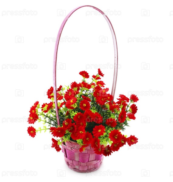 Висящая корзина с цветами, изолированными на белом фоне
