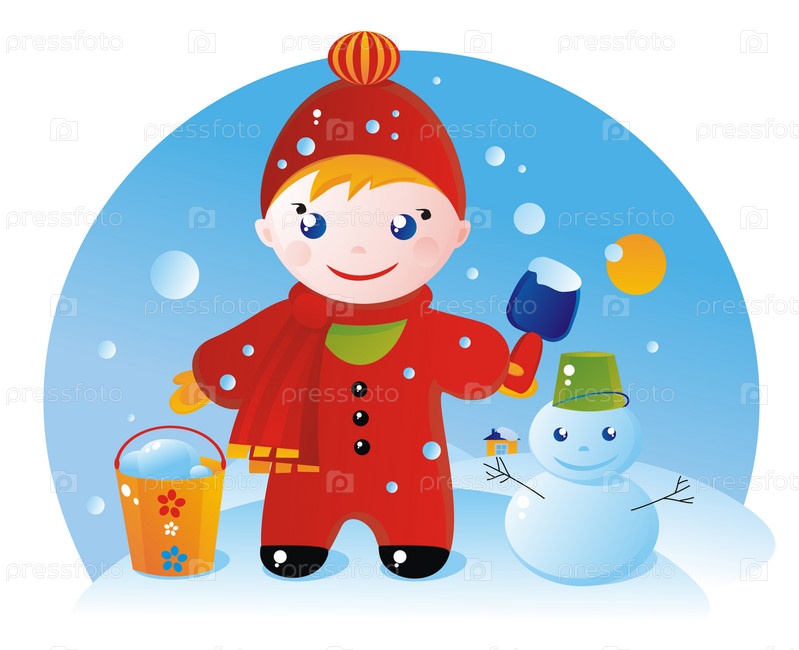 Мальчик и снеговик на зимней прогулке, вектор