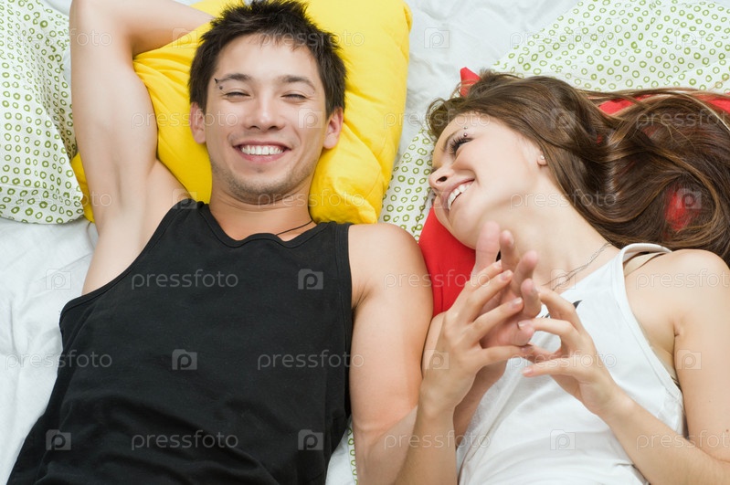 Счастливая молодая пара лежит в кровати