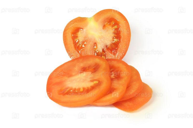 Красные томаты нарезаны кругами, лежащими на белой тарелке