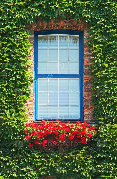 Зеленый плющ вокруг окна
