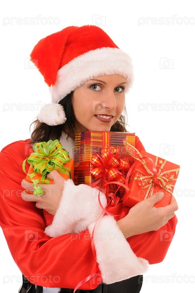 Девушка в костюме Санта Клауса держит в руках подарки