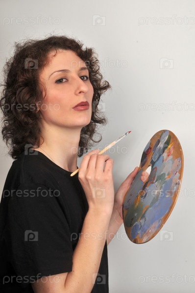 Женщина держит в руках палитру и собирается рисовать на стене