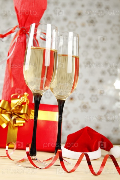 Два бокала, подарочная коробка и новогодний колпак