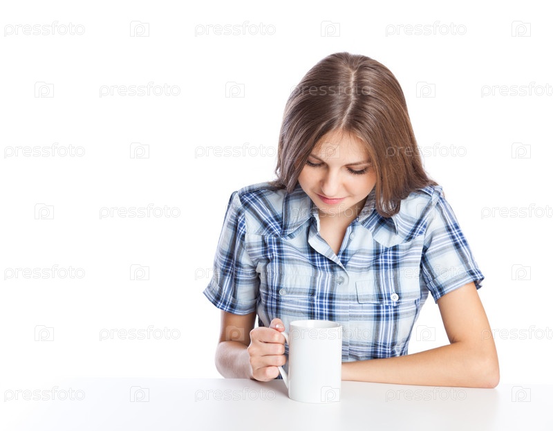 Девочка-подросток с чашкой кофе. Изолирована на белом