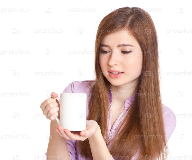 Девочка-подросток с чашкой кофе. Изолирована на белом
