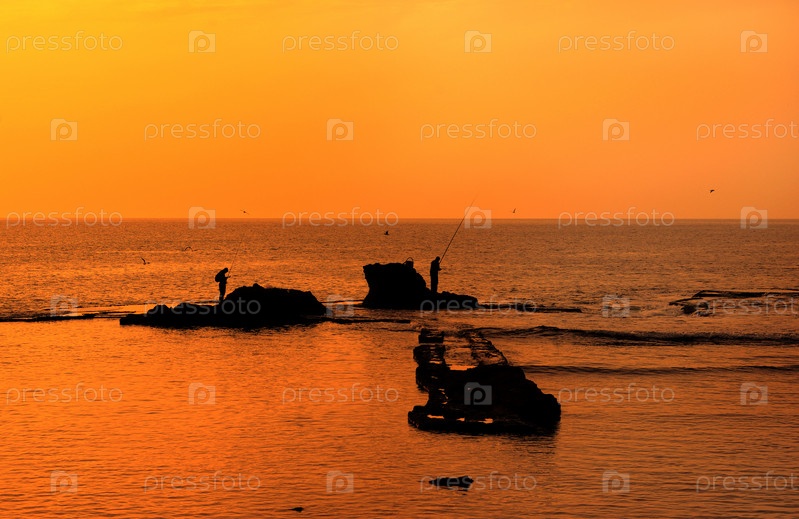 Рыбалка на закате, побережье Средиземного моря, Израиль