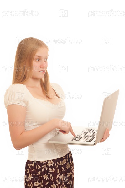 Портрет удивленной девушки, держащей ноутбук