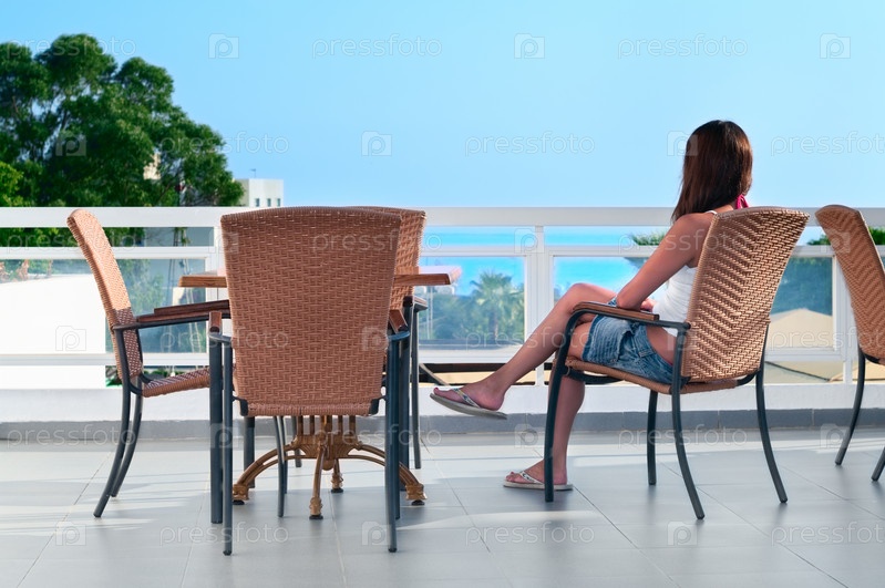 Молодая девушка сидит на балконе отеля и смотрит вдаль