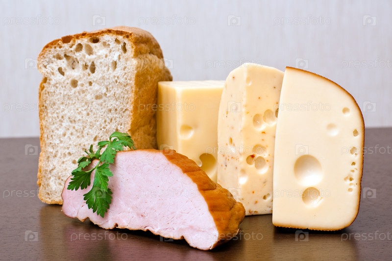 Пшеничый хлеб, ветчина и различные сыры на столе