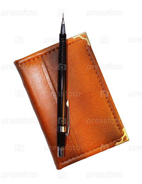 Кожаный блокнот и механический карандаш на белом фоне
