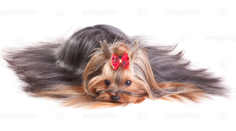 Йоркширский терьер с бантиком на белом фоне