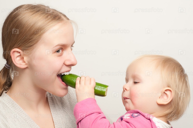 Маленькая дочь, кормящая свою молодую маму огурцом