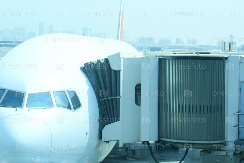 Нос самолета с присоединенным телескопическим трапом
