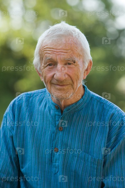 Портрет пожилого мужчины в синей рубашке на фоне природы