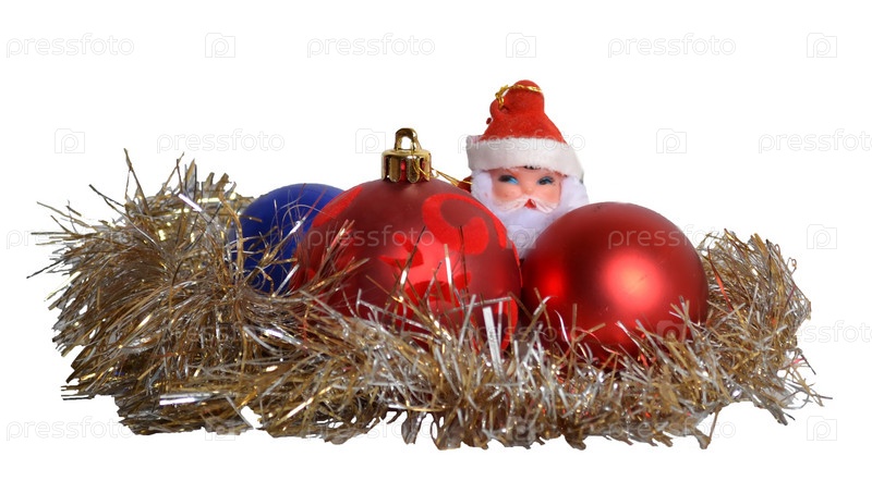 Красные новогодние шары, гирлянда и игрушечный Дед Мороз на белом фоне
