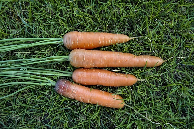 Четыре оранжевые моркови на фоне зеленой травы