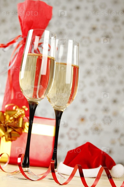 Новогодняя композиция. Два стеклянныж бокала с вином и подарки в красной упаковке