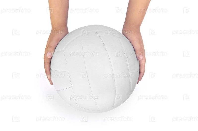 Белый волейбольный мяч в руках ребенка, изолированный на белом фоне