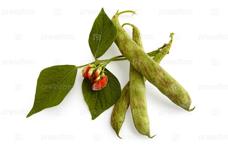 Стручки фасоли с цветком и листьями на белом фоне