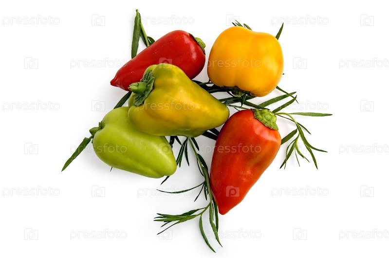 Яркие перцы с веточками эстрагона на белом фоне