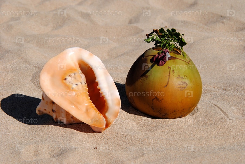 Молодой кокос и ракушка на песке, Бали, Индонезия