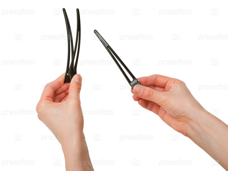 Две черные пластиковые клипсы в руках изолированы на белом фоне