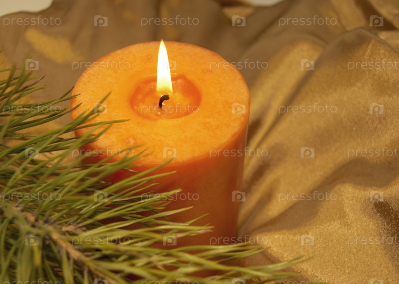 Рождественская свечка и колючая елочная ветка крупным планом