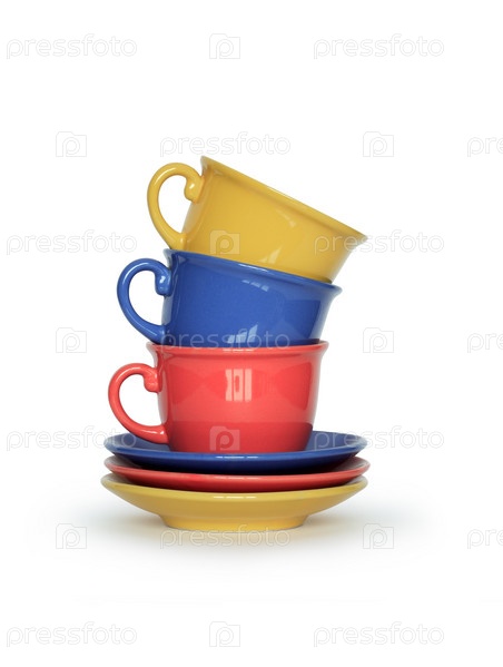 Чайные чашки с блюдцами разных цветов на белом фоне