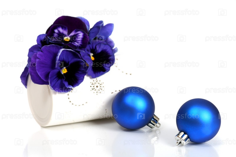 Рождественская композиция с синими шарами и цветами на белом фоне