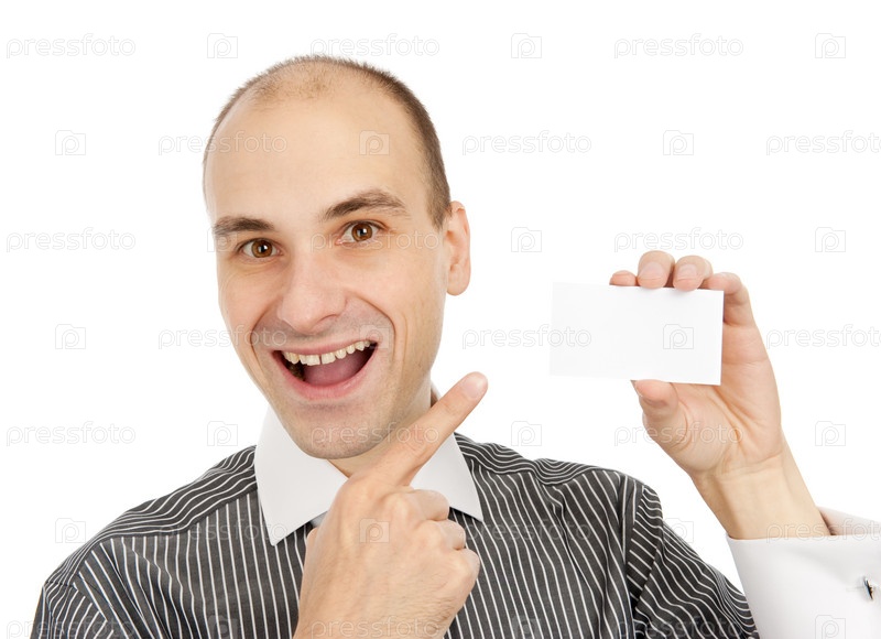 Бизнесмен с пустой визитной карточкой на белом фоне
